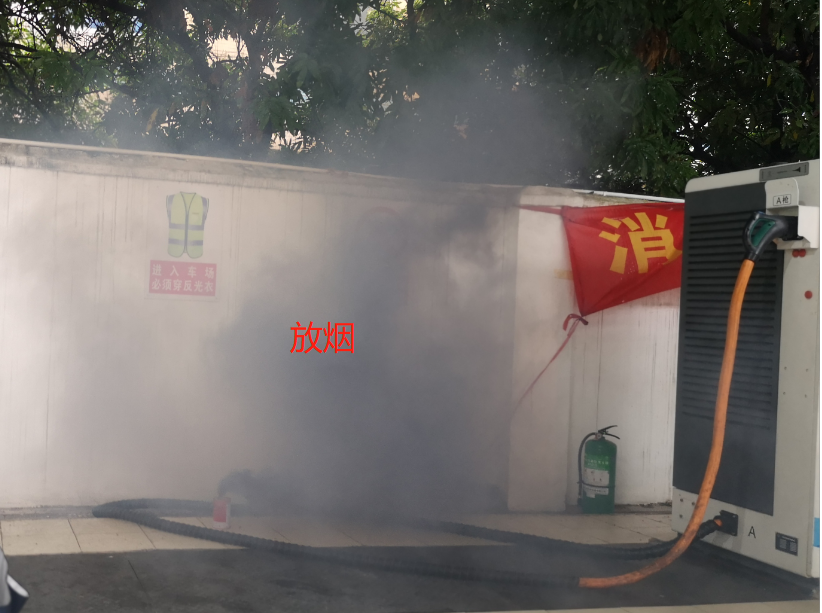 1.放煙-模擬充電樁模塊爆炸(點(diǎn)燃煙霧彈)
