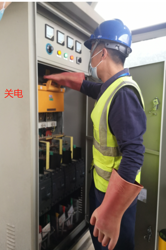 2.關(guān)電-雙手戴上絕緣手套,找到對(duì)應(yīng)充電樁配電箱斷開電源開關(guān),必須用右手,身體其他部位不能接觸配電箱
